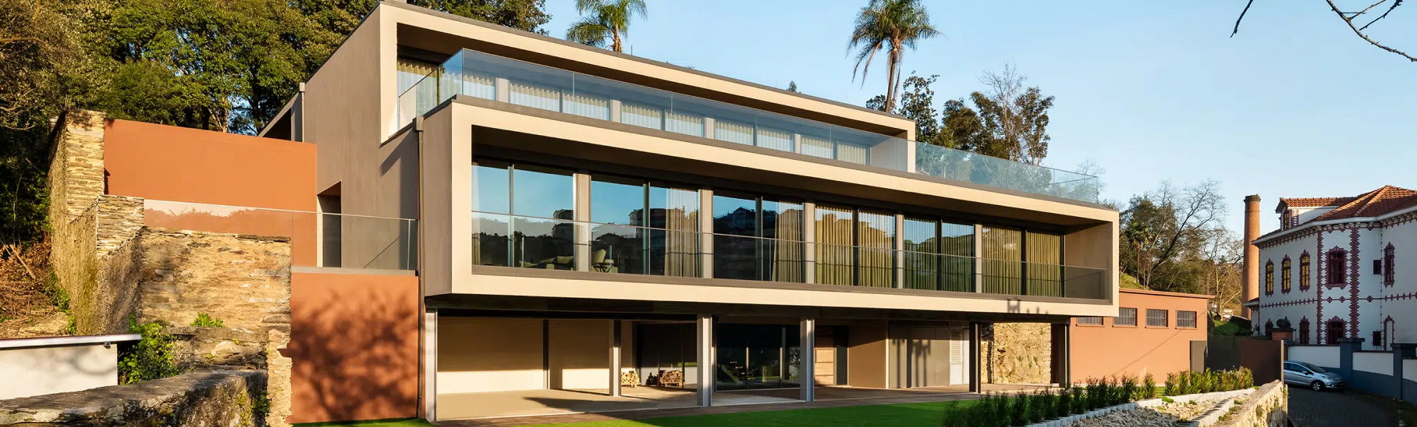 O projeto Caminho Velho insere-se numa paisagem única que liga perfeitamente com o sistema de correr +K8000, de linha minimalista aplicado em vãos de grande dimensão para uma vista ampla do exterior. As portas e as janelas, dos sistemas +K8000 e +E3600, de rotura térmica, têm acabamento Noir 100 Sablé. Os sistemas de alumínio escolhidos, que incluem guarda-corpos, são ainda combinados com a madeira numa ligação harmoniosa com o Douro.